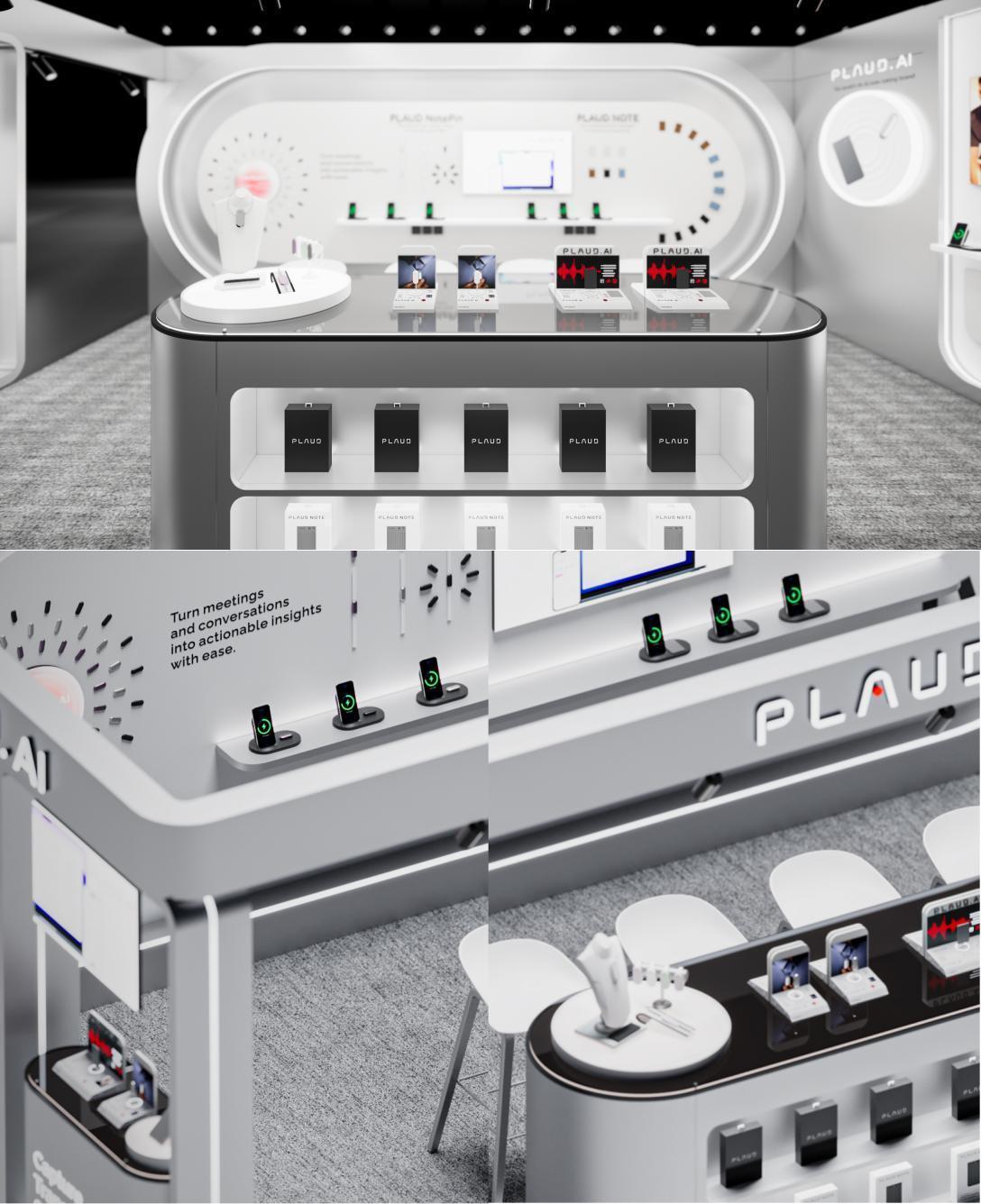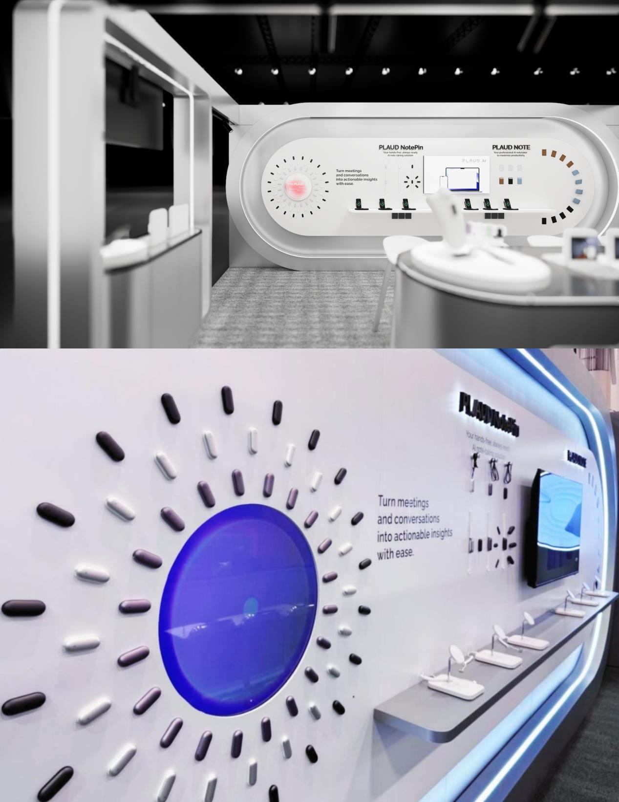 inDare团队延续PLAUD.AI的产品专属设计语言造型作为主要元素的融合,运用模块化展示搭配产品有序创意化展示的铺排陈列方式,作为更高效的展示手段,解决了客户多元性产品特征的展示的陈列组合形式,以达到进一步突显产品的多样性和技术优势。